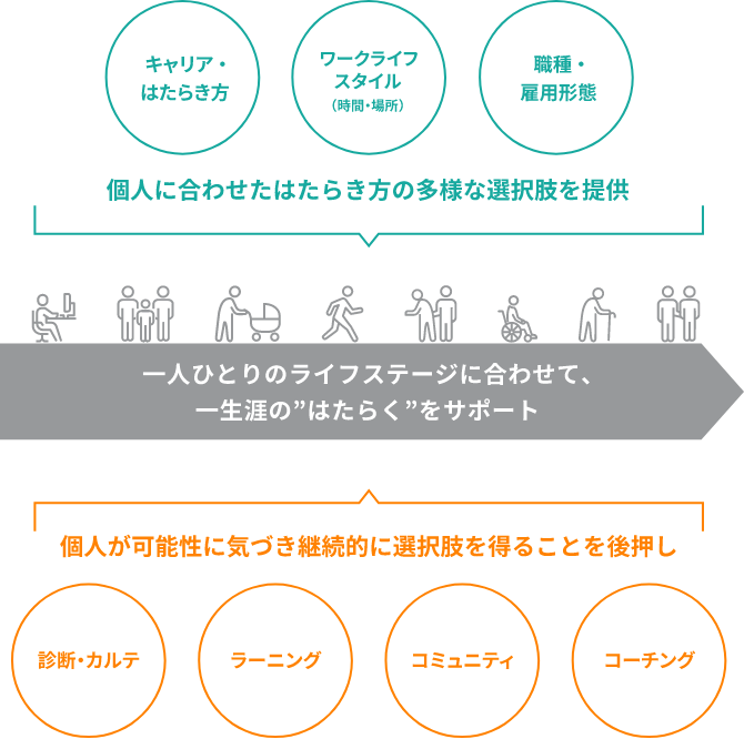はたらく個人のライフステージの変化や適性・能⼒に合わせて、はたらく機会と気づきを提供しています。また、仕事選びのタイミングだけではなく、はたらく個⼈の⽣涯に寄り添い続けるパートナーとして、仕事以外の領域での支援も実施。すべてのライフステージにおいて、継続的に十分な選択肢を得られるよう、学びの機会を提供しています。