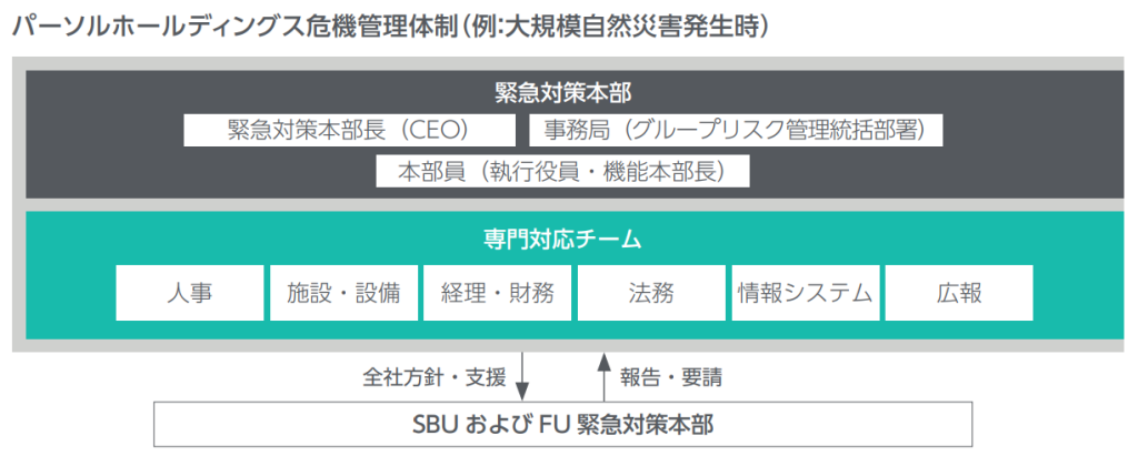なお、パーソルホールディングスの代表取締役社長CEOが特に重大な危機と判断した場合、パーソルホールディングスに緊急対策本部を設置します。