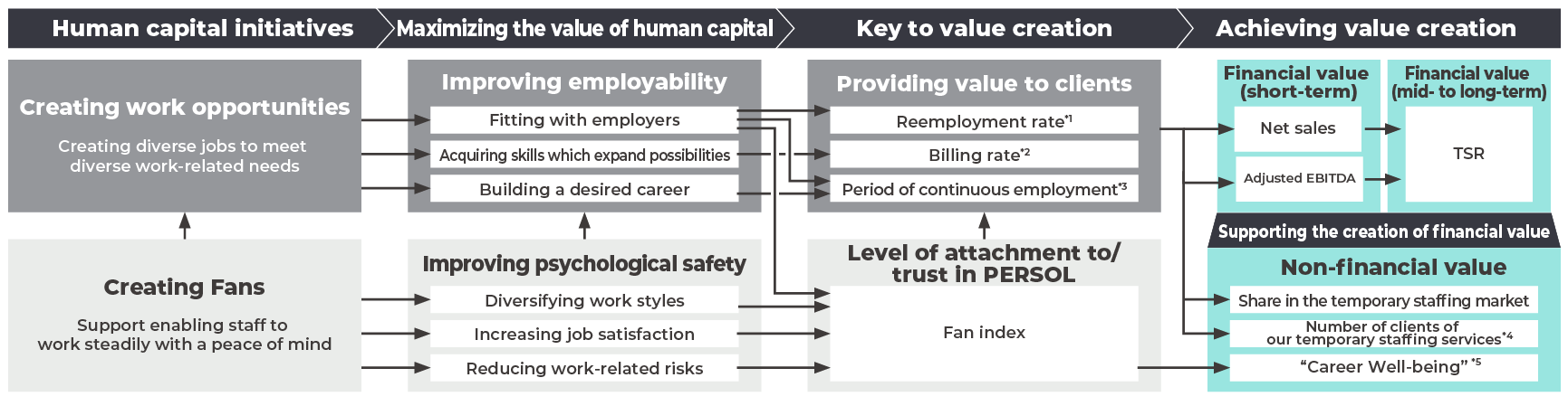 A larger number of contracts and higher value provided to clients, achieved through fitting, will contribute to the growth of net sales and adjusted EBITDA and lead to the medium- to long-term growth of the business and then to an increase in TSR. Further, we will improve temporary staff's capabilities and solve a range of HR issues, thereby building relationships of trust with our clients. At the same time, we will create new employment by leveraging our expertise in connecting companies with people and support the labor market.