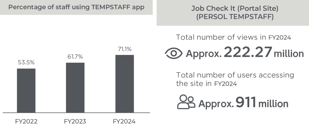 In the fiscal year ended March 31, 2025, we added a chat function and consultation service to the TEMPSTAFF app with the aim of facilitating even more timely communication between our employees and temporary staff currently on assignment. The TEMPSTAFF app is used by approximately 71% of staff currently working on job assignments. The chat function enables temporary staff on dispatch and our PERSOL TEMPSTAFF agents to share status updates and information smoothly, and the app also provides access to a career consultation service, giving temporary staff an easy way to discuss their future career plans.