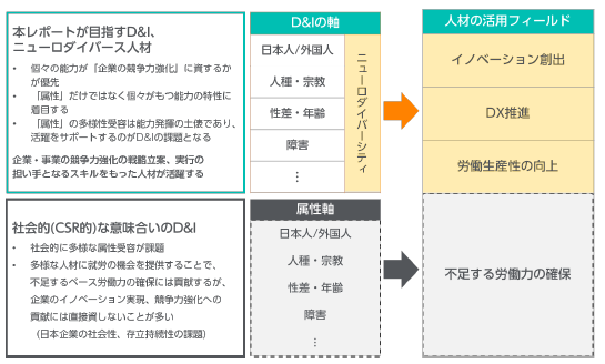 しかしながら、ND人材を含め、はたらく意欲・能力を持ちながらも十分な機会を得られていない、シニア、女性、外国人材、障害者などの人材層に対し、積極的な採用・活用を行う企業はいまだ少なく、あくまでCSR観点での「D&I」施策に留まっていることが、企業競争力を高める真の「D&I」の取り組に進められない大きなボトルネックとなっているのが現状です。