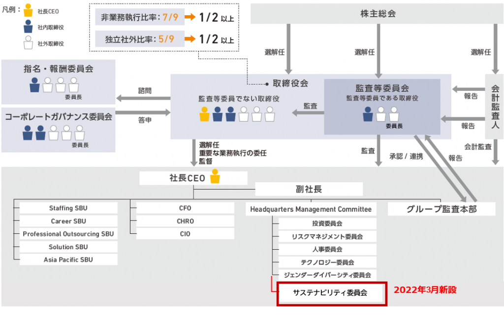 パーソルグループはビジョン「はたらいて、笑おう。」が世界中で実現されることを目指し、創業当時から掲げている経営理念「雇用の創造、人々の成長、社会貢献」を根幹にさまざまな取り組みを推進しています。この度、サステナビリティを経営の中核とおき、ESGに関する取り組みや情報開示の促進と中長期的な企業価値の向上を視野に実効性を高めるため、サステナビリティ委員会を設立いたしました。加えて、2022年度からは執行役員CSO(Chief Strategy Officer)をおき、グループサステナビリティ本部を設置することでグループ一体となり、持続的可能な社会の実現に向けより一層貢献していきます。