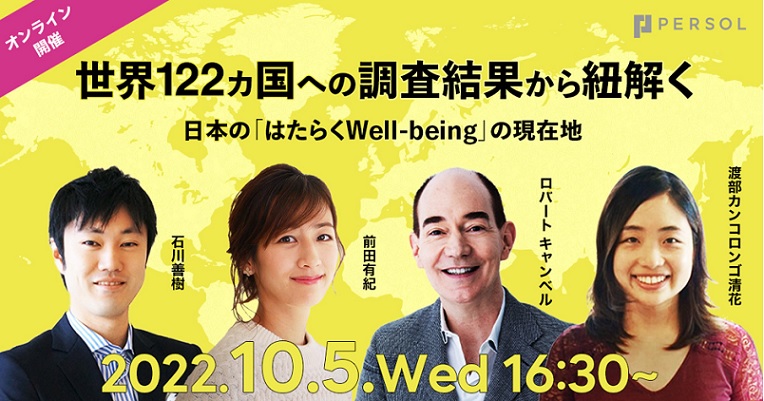 総合人材サービスのパーソルホールディングス株式会社(本社:東京都港区、代表取締役社長 CEO:和田孝雄)は、10/5(水) 16:30より、オンラインLive、世界122カ国への調査結果から紐解く、日本の「はたらくWell-being」の現在地を開催することをお知らせいたします。