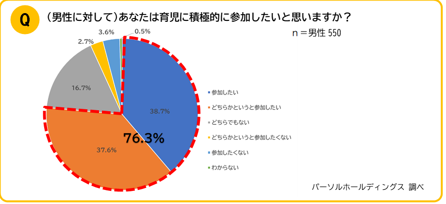 男性に対して「育児に積極的に参加したいと思いますか?」とたずねると「育児に参加したい」が全体の76.3%と4人に3人までの男性が育児への参加を望んでいることが分かります。