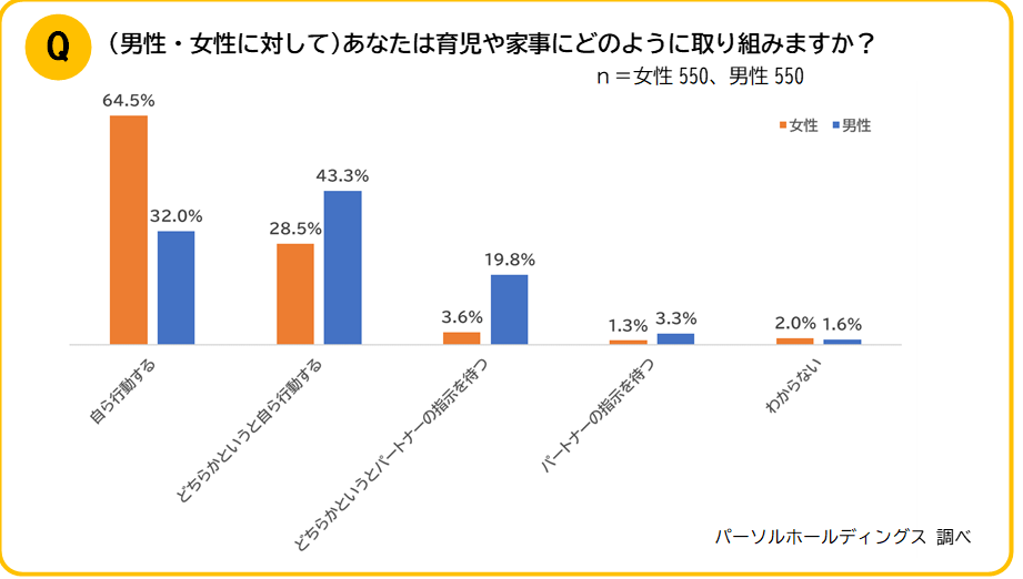 - 男性の4人に3人が育児に積極的に参加したいと回答するも、育児に関して「パートナーの指示を待つ」と答えた方は23.1%。