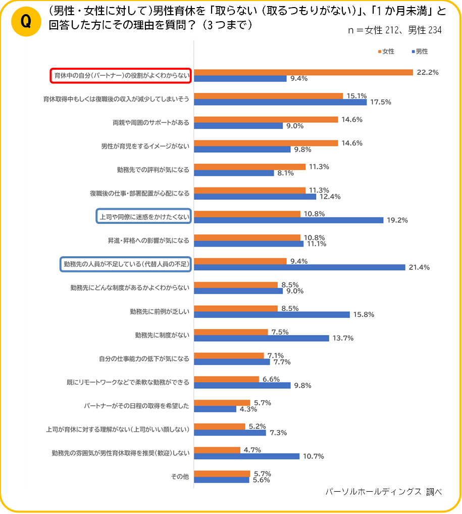 一方の女性は「育休中のパートナーの役割がよくわからない」がトップで22.2%、「パートナーの育児をするイメージがない」も14.6%と、男性の「取るだけ育休」や「指示待ち育休」を懸念していると考えられます。