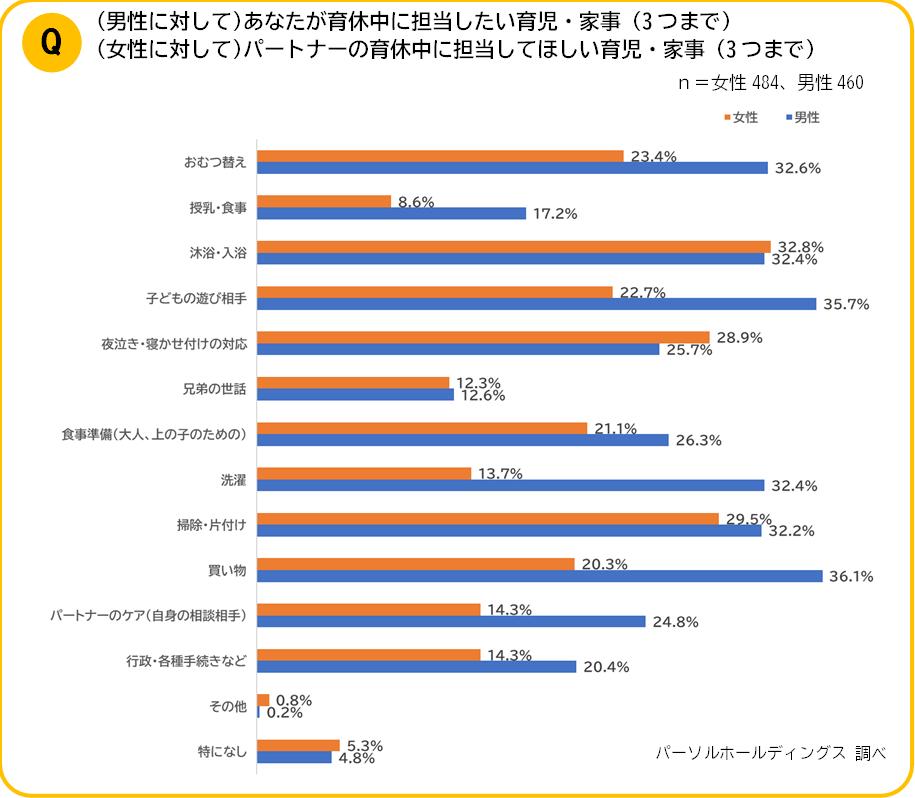 男性に「育休期間中に担当したい(担当する)育児・家事」を質問したところ、上位に「買い物」、「子どもの遊び相手」、「おむつ替え」が並んだ一方、女性は「沐浴・入浴」「掃除・片付け」、「夜泣き・寝かせ付けの対応」が並ぶ結果となりました。育児や家事におけるパートナー間でしっかり話し合い、互いに期待している役割について共有することが大事であることが分かります。