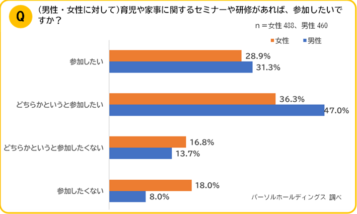 育児および家事に関するセミナーや研修があれば参加したいかと聞いたところ、男性の約8割が参加を希望。女性も65.2%の約7割が参加したいと答えました。フリーコメントでは、育児に必要な知識の教育、効率よくお互い家事分担ができるために心得、子どもの成長に合わせた食事の準備などについて学べる研修を希望するなどの声がありました。