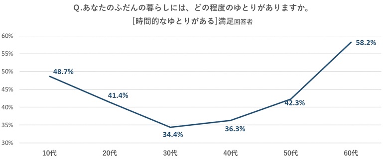 「暮らしにおける時間的なゆとり」について、「ある」と答えた割合が最も少なかった年代は30代で34.4%、次に少なかったのは40代で36.3%という結果だった。