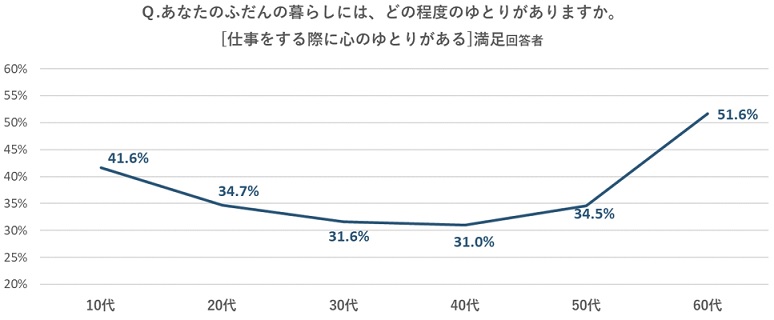 ・「ふだんの暮らしには、どの程度ゆとりがありますか?」という質問に「(時間的なゆとりが)ある」と答えた割合は60代が58.2%で最も高かった一方、30代が34.4%で最も低く、次いで40代が36.3%と2番目に低かった。■仕事をする際の心のゆとり:「仕事をする際の心のゆとり」について、「ある」と答えた割合が最も少なかった年代は40台で31.0%だった。