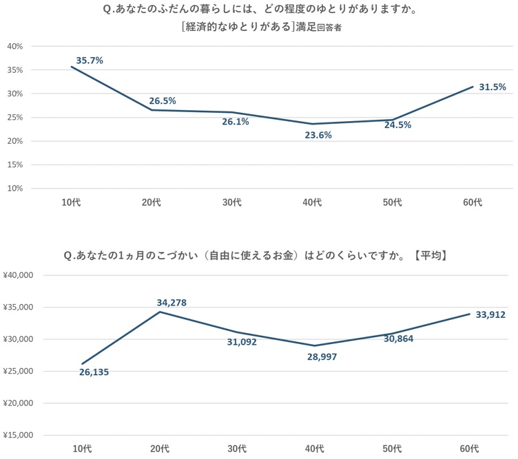 「経済的なゆとり」について、「ある」と答えた割合は、10代が35.7%で最も高く、40代が23.6%で最も低かった。また、「1か月のおこづかい(自由に使えるお金)はどれくらいですか?」という質問に対して最も多い額を答えたのは20代であった。なお、40代は10代を除けば最も少ない金額だった。