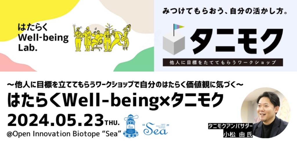今回はその一環として株式会社オカムラと共同で、他人に目標をたててもらうという、従来とは異なる新しい目標設定手法として注目を集める「タニモク」と協業し、参加者に自身の“はたらくWell-being”について、参加者同士で学び、より深く考えてもらうことを目的としたワークショップ「はたらくWell-being×タニモク」を開催することとしました。本イベントは、さまざまな文脈で東京に集まる人たちが共創を起こし、これからの「はたらく」の潮流をつくる場である「Open Innovation Biotope “Sea”」で開催します。■「はたらくWell-being×タニモク」の概要