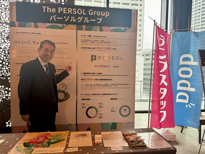 2025年7月、パーソルグループは障害者の活躍推進を目指す国際イニシアティブ「Valuable 500」に加盟しました。さらにこのたび、Valuable500・日本財団・日本経済新聞社が共催し、日本で開催された世界初の障害者インクルージョンに関するサミット「SYNC25 アカウンタビリティ・サミット」にも参加。12月3日(水)~4日(木)の2日間、会場にパーソルグループのブースを出展。DEI(Diversity, Equity & Inclusion)ポリシーや、障害者雇用に関するデータや取り組み、特例子会社のパーソルダイバースで製造しているオリジナルクッキー、シルク石鹸、シルクハンカチなどの展示を行いました。
