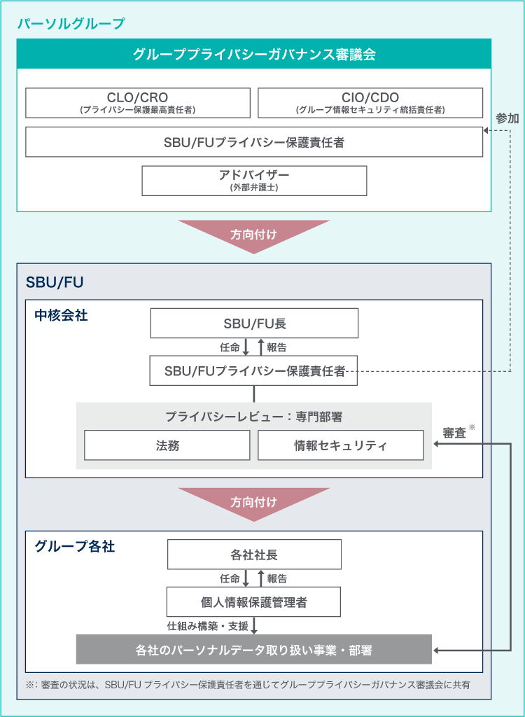 パーソルグループは、パーソナルデータの利活用に伴うプライバシーリスクをグループ横断で適切に管理するため、「グループプライバシーガバナンス審議会」を設置しています。審議会は原則として四半期に1回開催され、グループのプライバシー保護最高責任者であるCLO/CRO(Chief Legal Officer/Chief Risk Officer)に加え、グループのパーソナルデータ利活用戦略を担うCIO/CDO(Chief Information Office/Chief Data Officer)、各SBUおよびFUのプライバシー保護責任者が参加し、パーソルグループにおけるプライバシー保護に関する方針・ルールの策定や重要なプライバシーリスクへの対応方針の決定を行うなどして、グループとしてプライバシーガバナンスの強化に努めています。