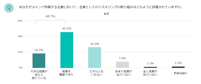 パーソルグループが提供する「リスキリング キャンプ(旧学びのコーチ)」が四半期ごとに行っている定点調査でも、企業においてDX化のためのリスキリング取り組み状況は約4割にも上ります。また、リスキリング実施企業の63.7%が、リスキリングの取り組みに成果が出ると実感しており、DX時代の到来が伺えます。