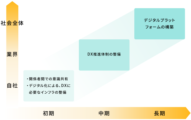 例えば、DX戦略の段階的なアプローチとして、初期、中期、長期に分けて自社のあるべき姿とやるべきことを定めていきます。初期のアプローチには「関係者間での意識共有」「必要なデジタルインフラの整備」などが挙げられるでしょう。中長期的には「DX推進体制の整備」「デジタルプラットフォームの構築」などの目標を定めます。このように段階を分けて取り組むことで、計画的かつ効果的なDX推進が可能になります。
