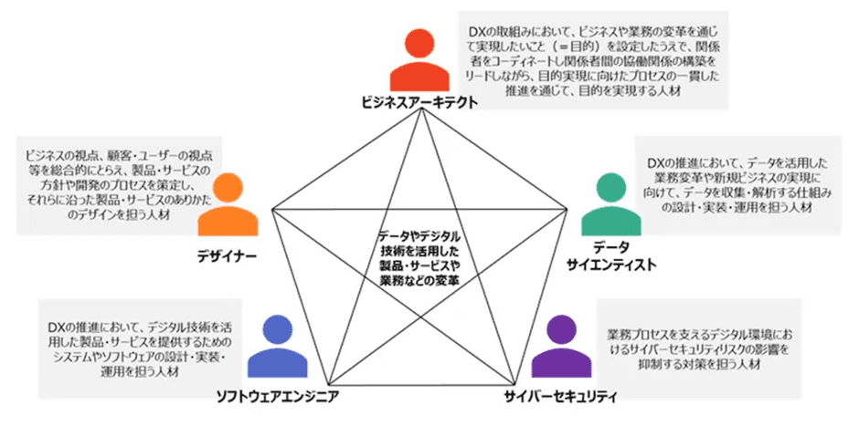 経済産業省が発表した「デジタルスキル標準」によると、DX人材に必要なスキルは以下5つの人材類型で分けられます。