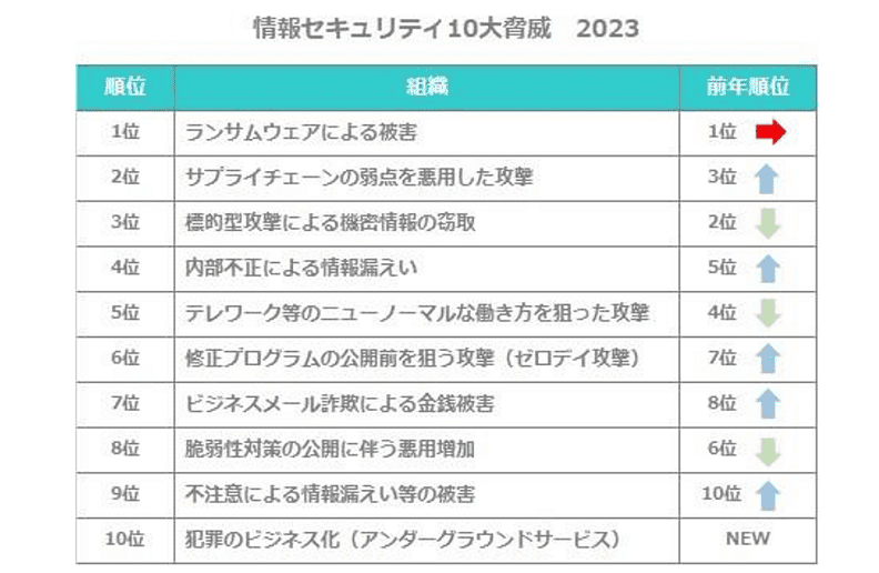 以下の表は、独立行政法人情報処理推進機構(IPA)が実際に発生した脅威から導き出した情報セキュリティ脅威のリストです。それによると、「ランサムウェアによる被害」が2年連続で1位になりました。