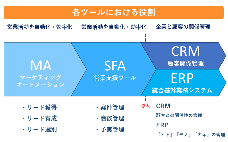 CRMと関連のあるツールに、MA、SFA、ERPがあります。MAはマーケティング領域の業務を、SFAは営業領域の業務を、ERPは企業の基幹となる業務を一元化し、それぞれ自動化することで業務効率化を図るツールです。各ツールはCRMと組み合わせることでより効果を発揮することもあるため、CRMの導入を検討する際は、これらのツールの特徴を知っておくと良いでしょう。以下で、CRMとの具体的な違いを解説します。
