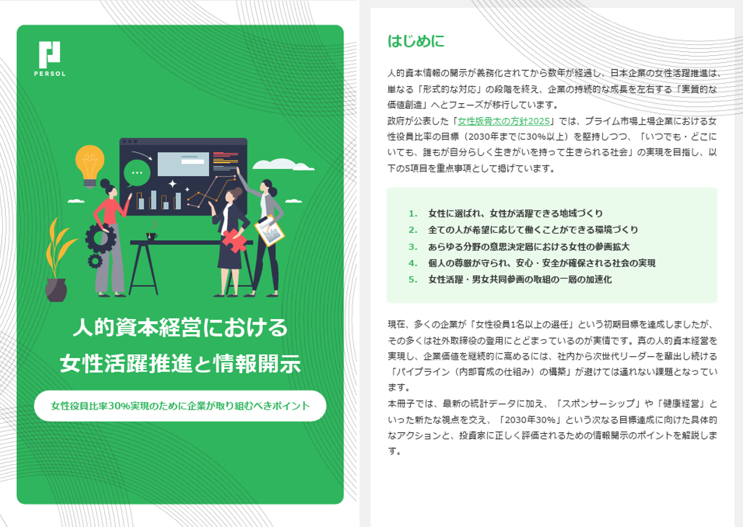 女性管理職の登用や育成は、社内施策として進めるだけでなく、人的資本経営や情報開示の観点から整理することも重要です。今後は、女性活躍推進の取り組みそのものだけでなく、どのような方針で進め、どのように社外へ示していくかも問われます。