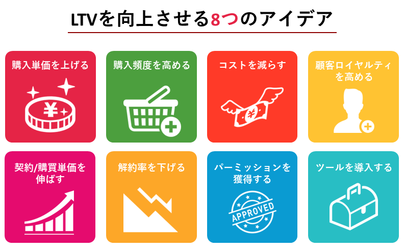 LTV(ライフタイムバリュー)を向上させるには、どのような方法があるのでしょうか。LTV向上を目指せる8つのアイデアをご紹介します。