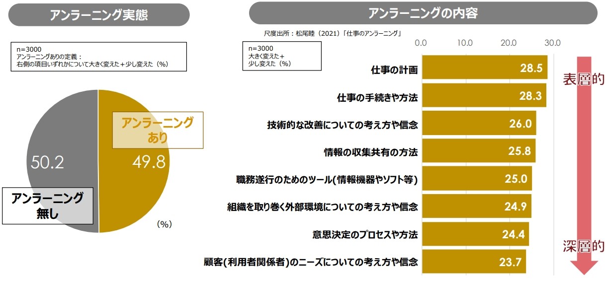 株式会社パーソル総合研究所が実施した「リスキリングとアンラーニングについての定量調査」では、正社員の約半数(49.8%)が何らかのアンラーニングに取り組んでいると回答しています。具体的な内容として、「仕事の計画」や「仕事の手続きや方法」が28%を超える一方で、「意思決定のプロセスや方法」(24.4%)、「顧客のニーズについての考え方や信念」(23.7%)といった思考や価値観に深く関わる領域では、やや低い割合にとどまっています。