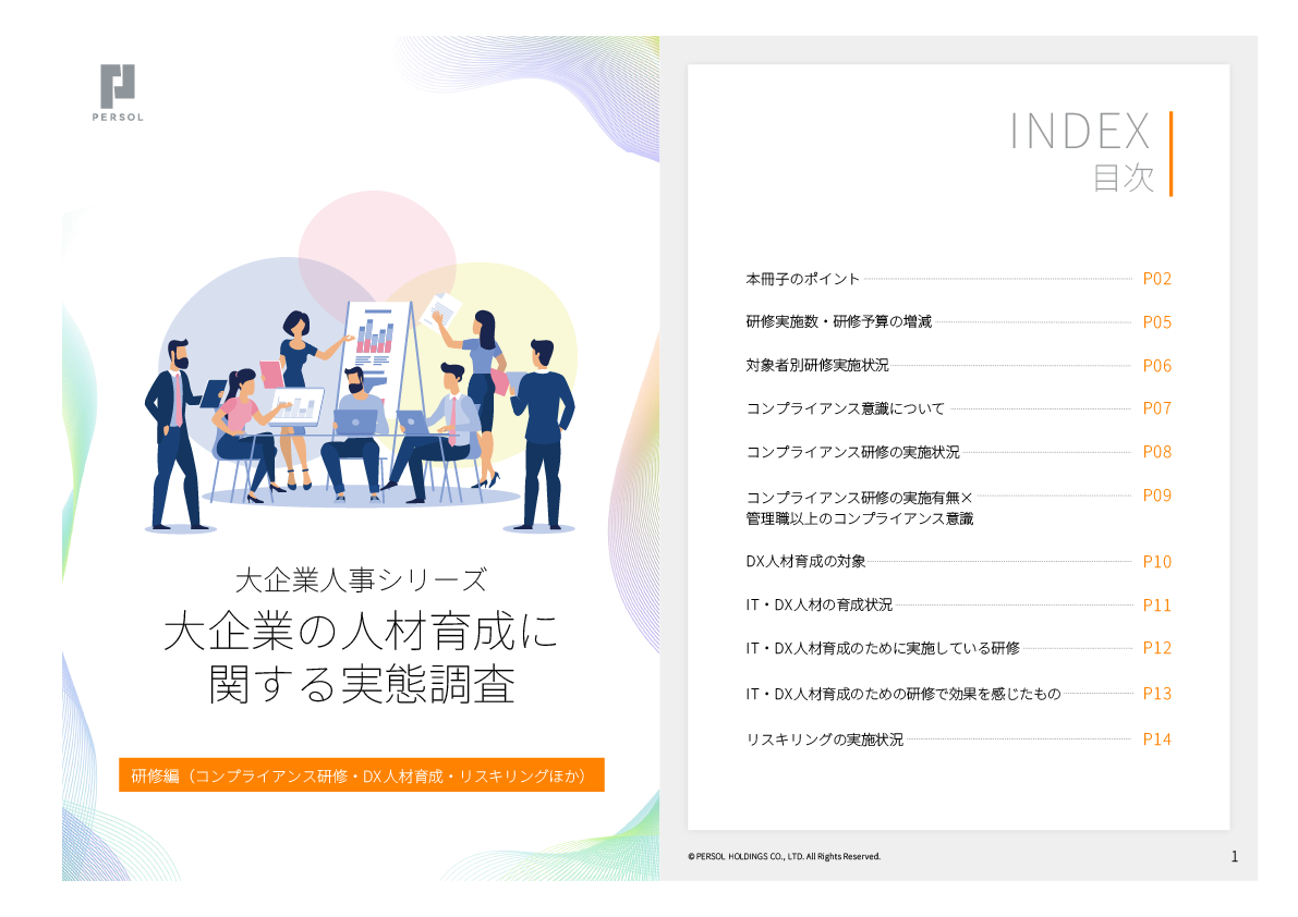 パーソルグループが実施した「大企業の人材育成に関する実態調査」では、経営層や管理職、人材の採用・育成に携わっている方600名への調査結果をもとに、研修予算の増減や対象者別の実施状況、IT・DX人材育成やリスキリングの取り組みなどの実態を明らかにしています。データをもとに戦略的な育成施策を検討し、未来を担う人材を育てるための基盤づくりにお役立てください。