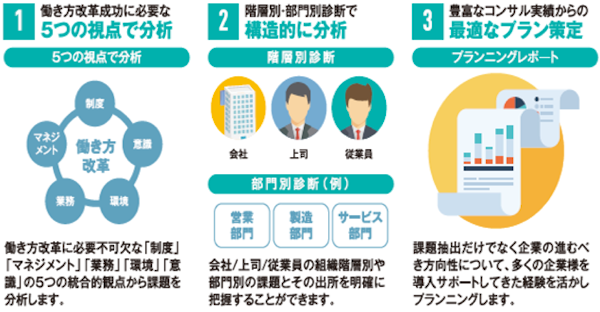 パーソルグループの人材コンサルティングの知見を活用し、現場の課題発見からテレワーク導入、さらに現場への定着まで、きめ細かくサポートさせていただきます。