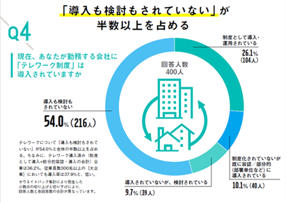 ここまでご紹介した通り、テレワークは生産性向上や優秀な人材確保等に有効な施策です。しかし、パーソルプロセス&テクノジーの調査では、回答者の勤務する会社の半数以上が「テレワークの導入も検討もされていない」という、まだまだ普及しているとは言い難い結果になっています。