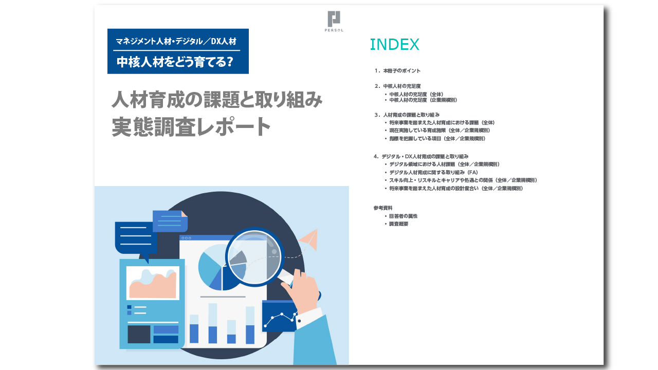 本冊子は、経営層・人事を対象にした「中核人材の充足度」「人材育成の課題と取り組み」「デジタル・DX人材育成についての課題と取り組み」についての全国調査の結果をレポートにまとめています。企業規模別の実態や動向をまとめていますので、ぜひご活用ください。