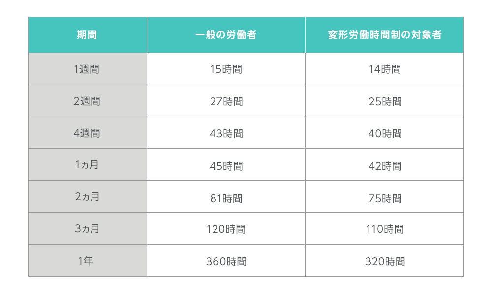 残業させるときには36協定の締結と届け出が必須となり、上限となる残業時間の原則は以下の表の通りです(特別条項による例外あり)。