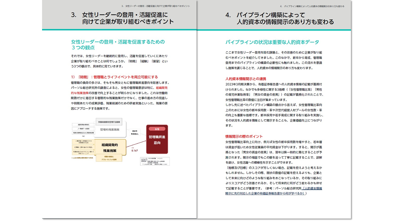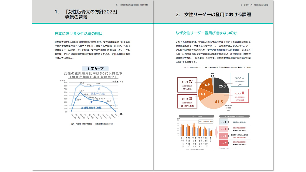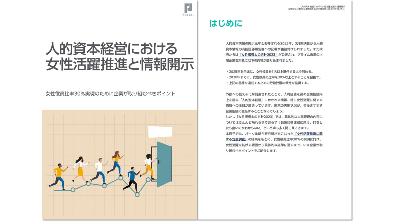 本冊子では、パーソル総合研究所がおこなった「女性活躍推進に関する定量調査」の結果をもとに、女性役員比率30%の実現に向け、女性活躍を妨げる要因から具体的な施策に至るまで、いま企業が取り組むべきポイントをご紹介します。