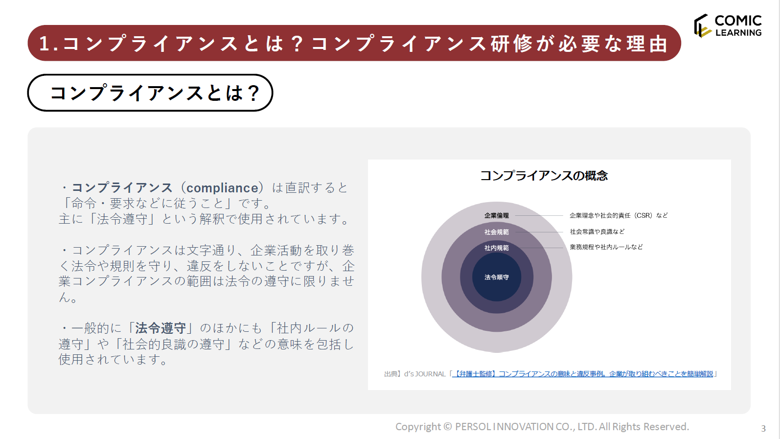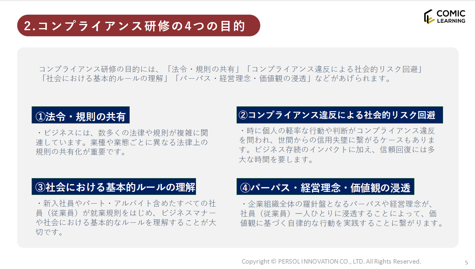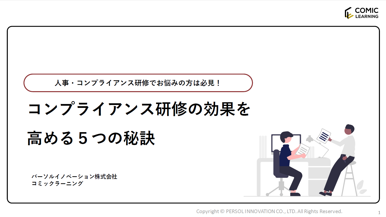 昨今、「コンプライアンス」という言葉が広く認知されるとともに、企業のコンプライアンスに対する重要性が高まっています。本資料では、コンプライアンス研修の効果を高めるための5つのポイントをまとめています。コンプライアンス研修の改善や見直しを検討されている方は、ぜひご活用ください。