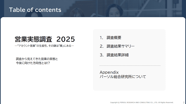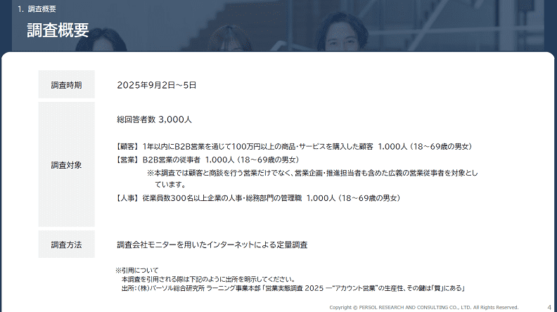 本資料は、パーソル総合研究所が2025年9月に実施した「営業実態調査2025」の結果から、アカウント営業において成果を生む関係構築のあり方や営業プロセス、営業人材を取り巻く課題を整理し、営業の生産性向上のヒントを示した調査レポートです。