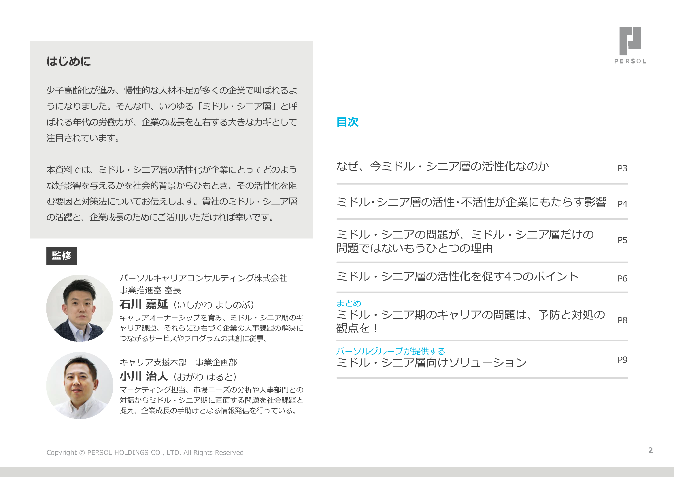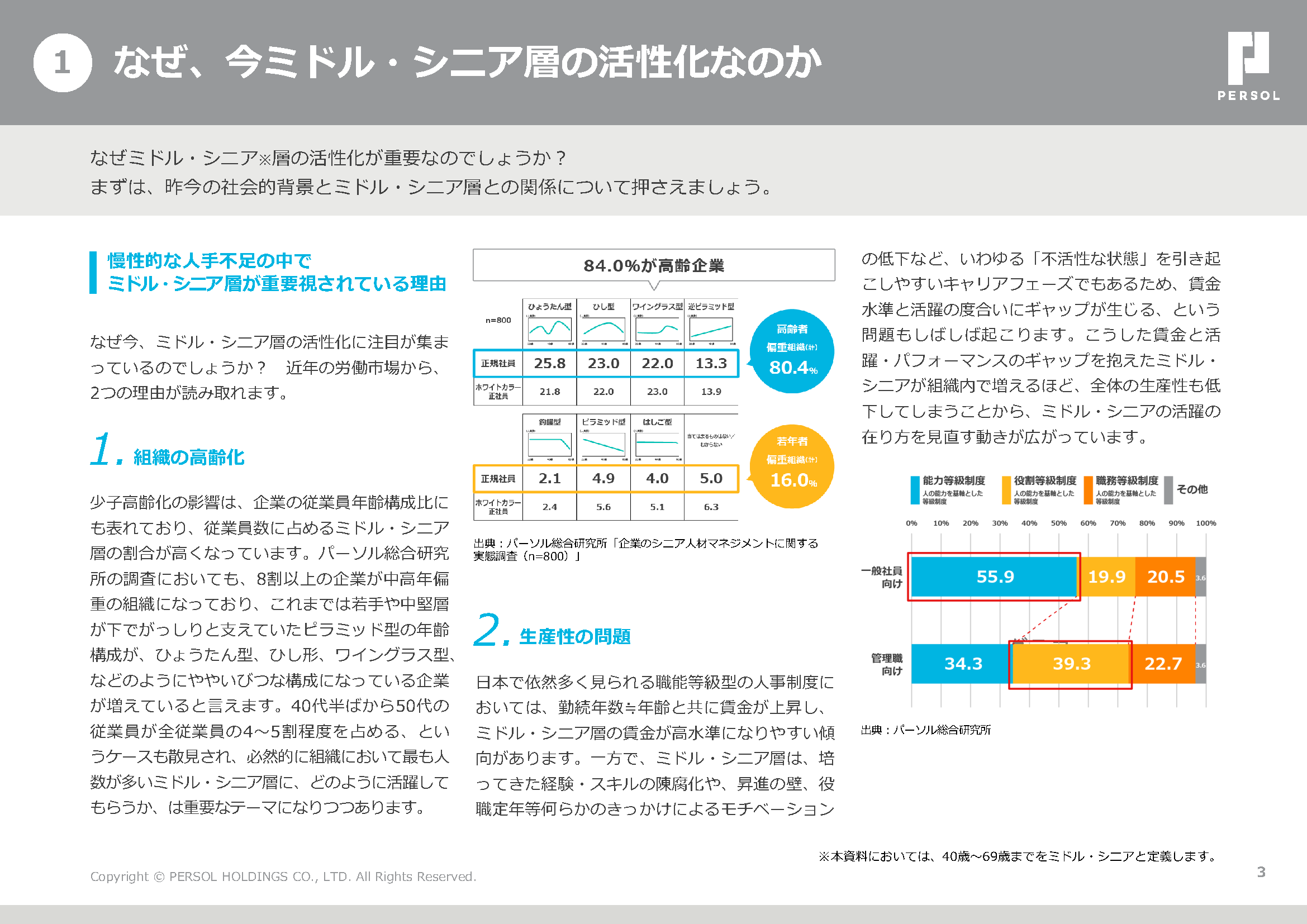 本資料は、ミドル・シニア層の活性化が企業にもたらす影響や背景を整理し、活性化を促すための課題と人事施策をまとめた一冊です。