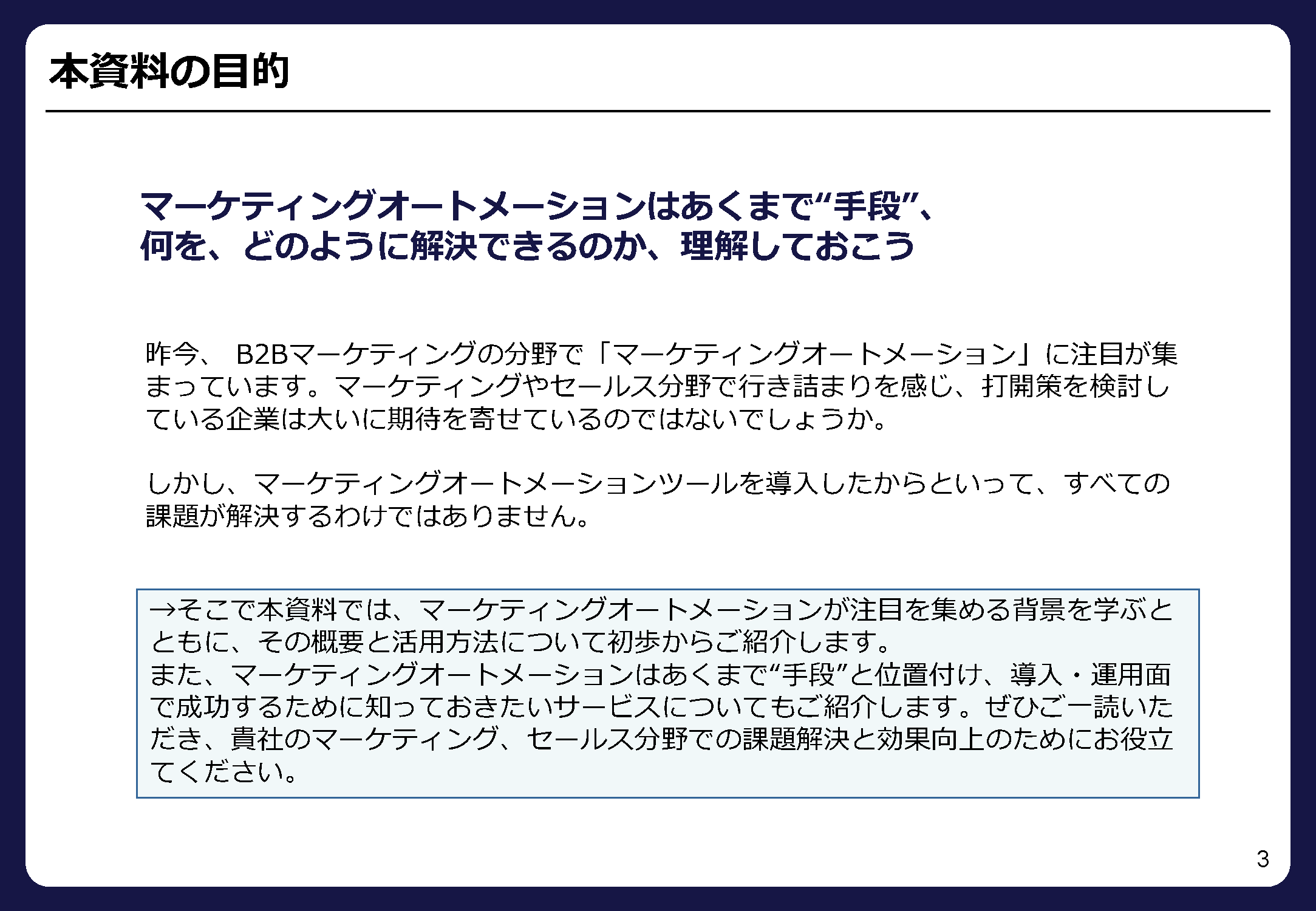 そこで本資料では、マーケティングオートメーションが注目を集める背景を学ぶとともに、その概要と活用方法について初歩からご紹介します。