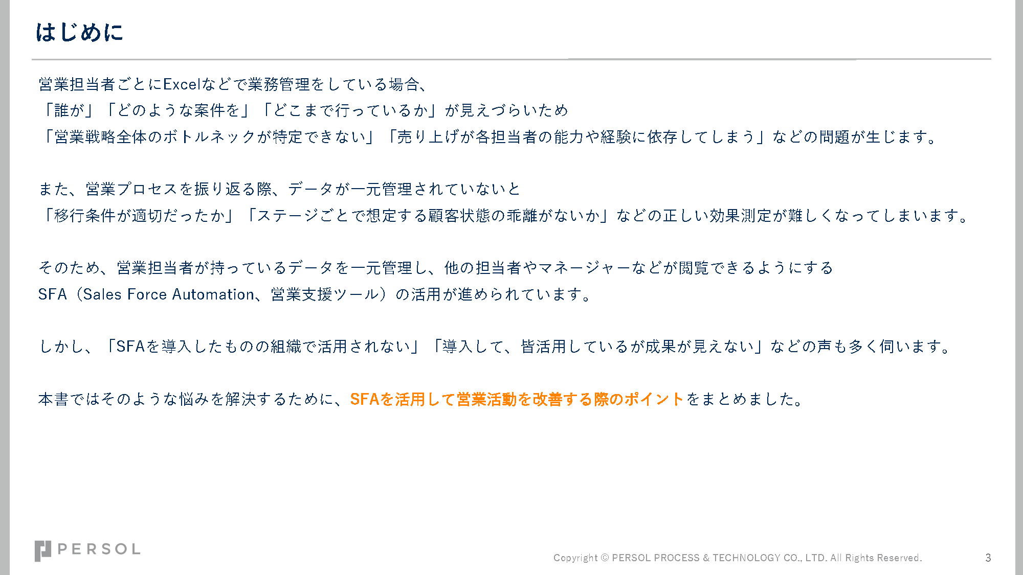 本書ではそのような悩みを解決するために、SFAを活用して営業活動を改善する際のポイントをまとめました。