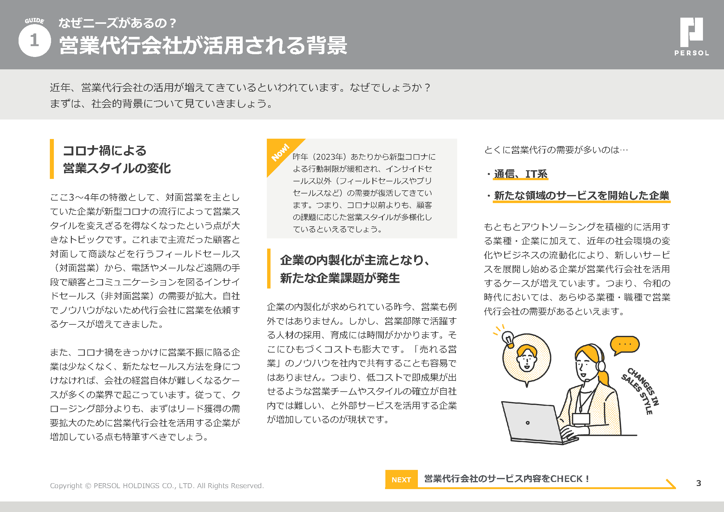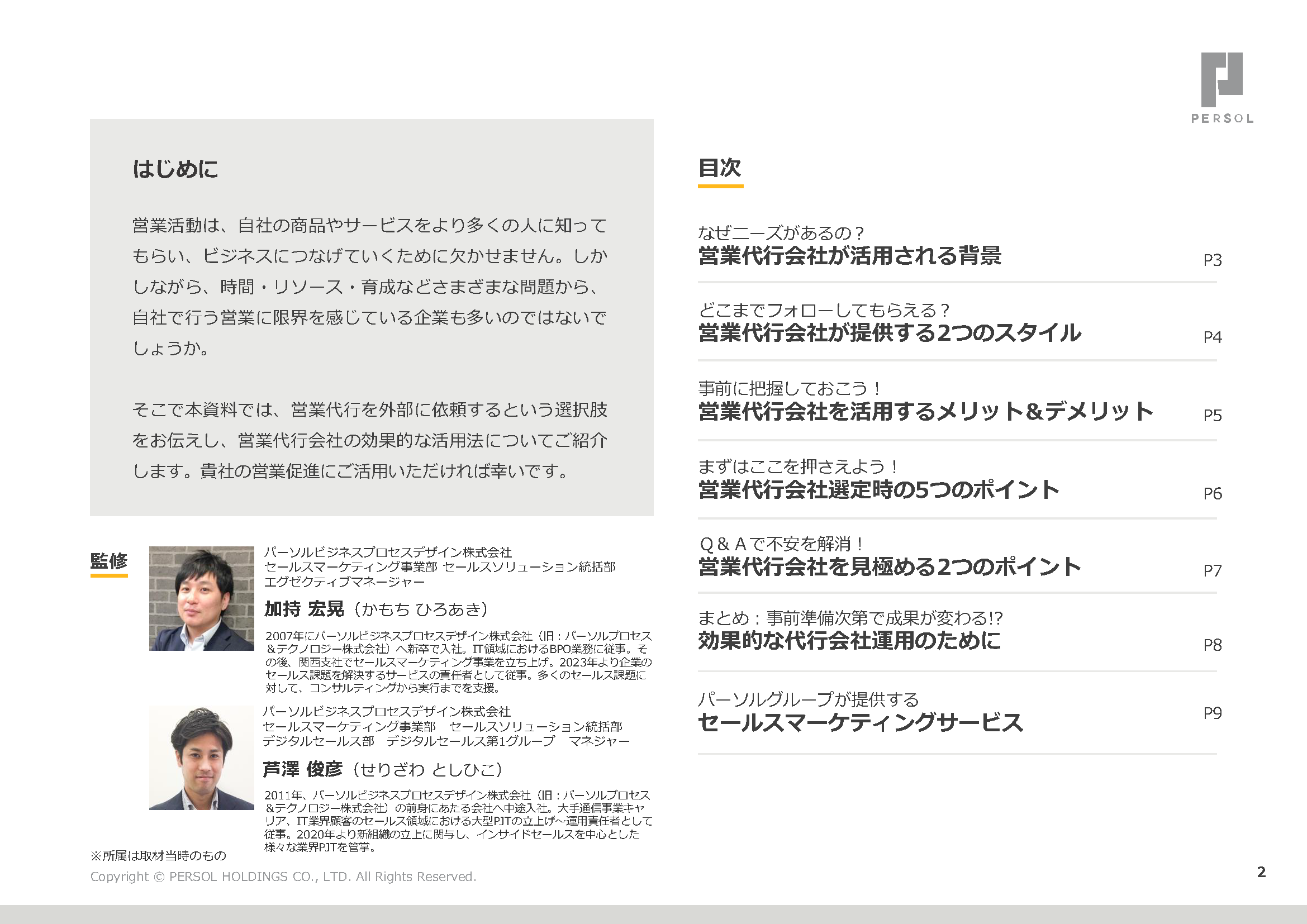 本資料では、営業代行会社を選ぶ際に押さえておくべきポイントと営業代行会社の効果的な活用方法をまとめています。営業代行会社の選定にお悩み中の方や、これから委託を検討する方はぜひご活用ください。