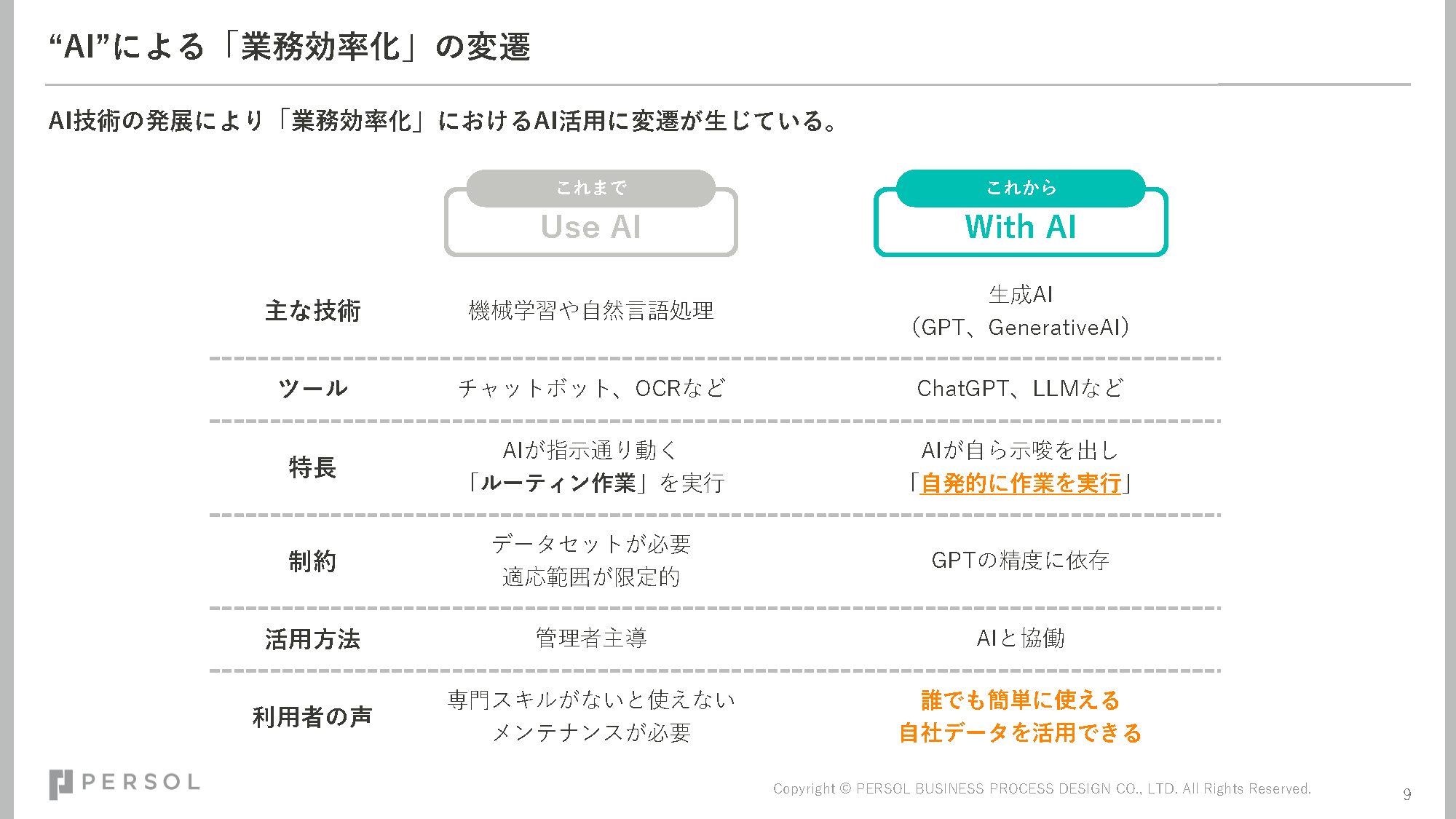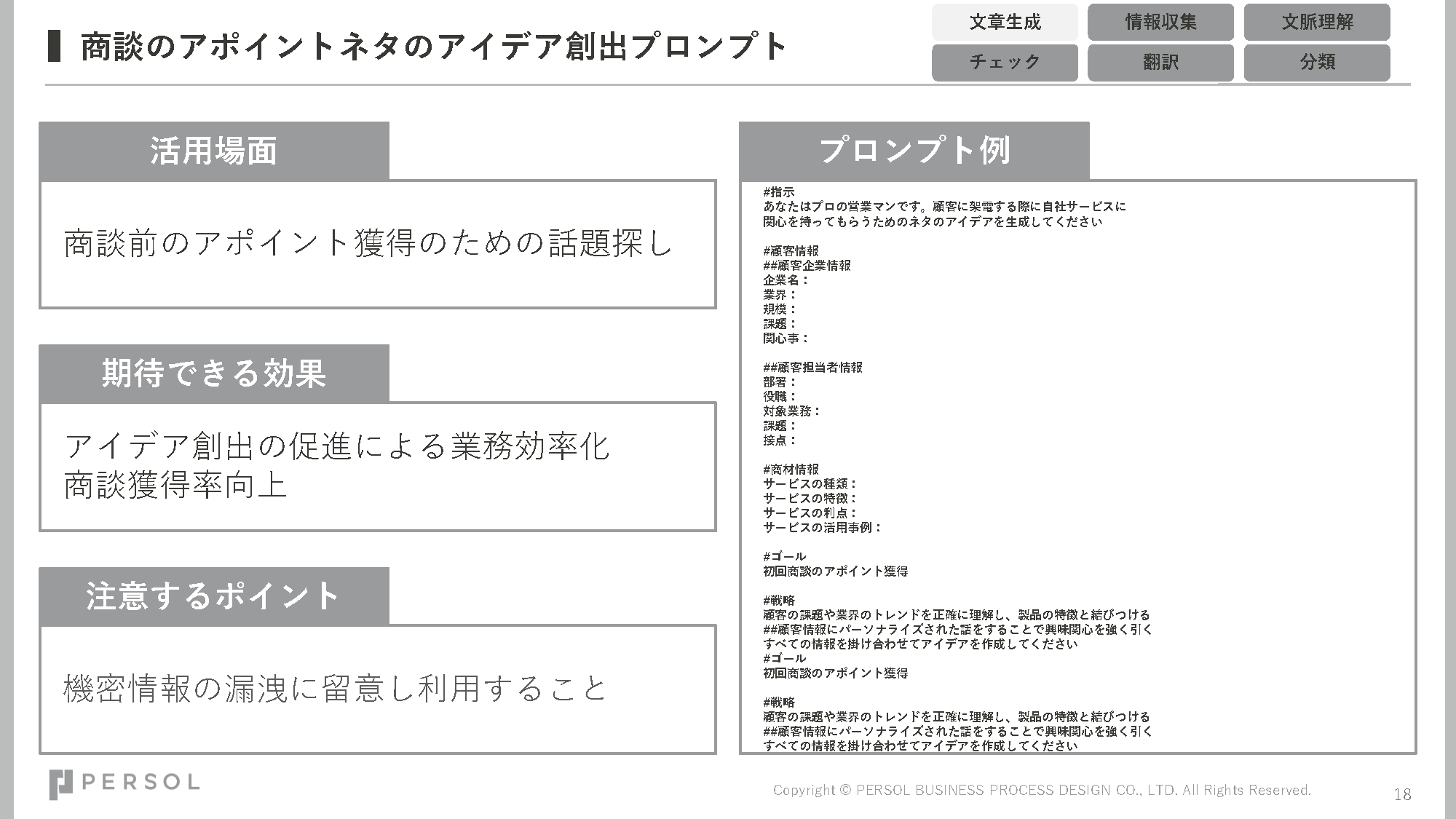 昨今様々なシーンでChatGPTをはじめとした生成AIの活用が浸透しています。営業現場においても、事務作業などの一部のタスクを生成AIに任せることで、業務効率化や営業生産性向上といった課題解決が期待できる事例が増えてきました。本資料では、生成AIの導入や業務適用に必要な考え方と進め方をはじめ、営業業務を効率化させるプロンプト集についてもご紹介します。これから生成AI の導入・活用を検討されている担当者の方をはじめ、実利用や活用定着に取り組まれている方はぜひご活用ください。