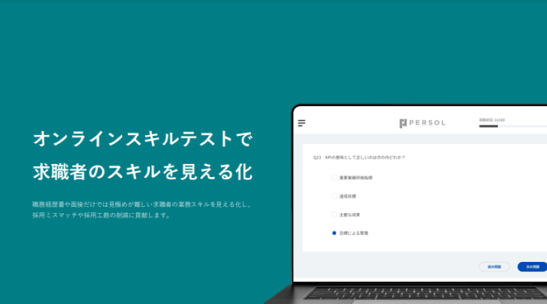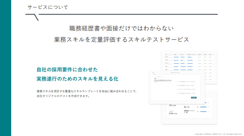 職務経歴書や面接だけではわからない業務スキルを定量評価するスキルテストサービスで、採用ミスマッチや採用工数の削減に貢献します。業務スキルを測定する豊富なスキルテンプレートを自由に組み合わせることで、自社オリジナルのテストを作成できます。