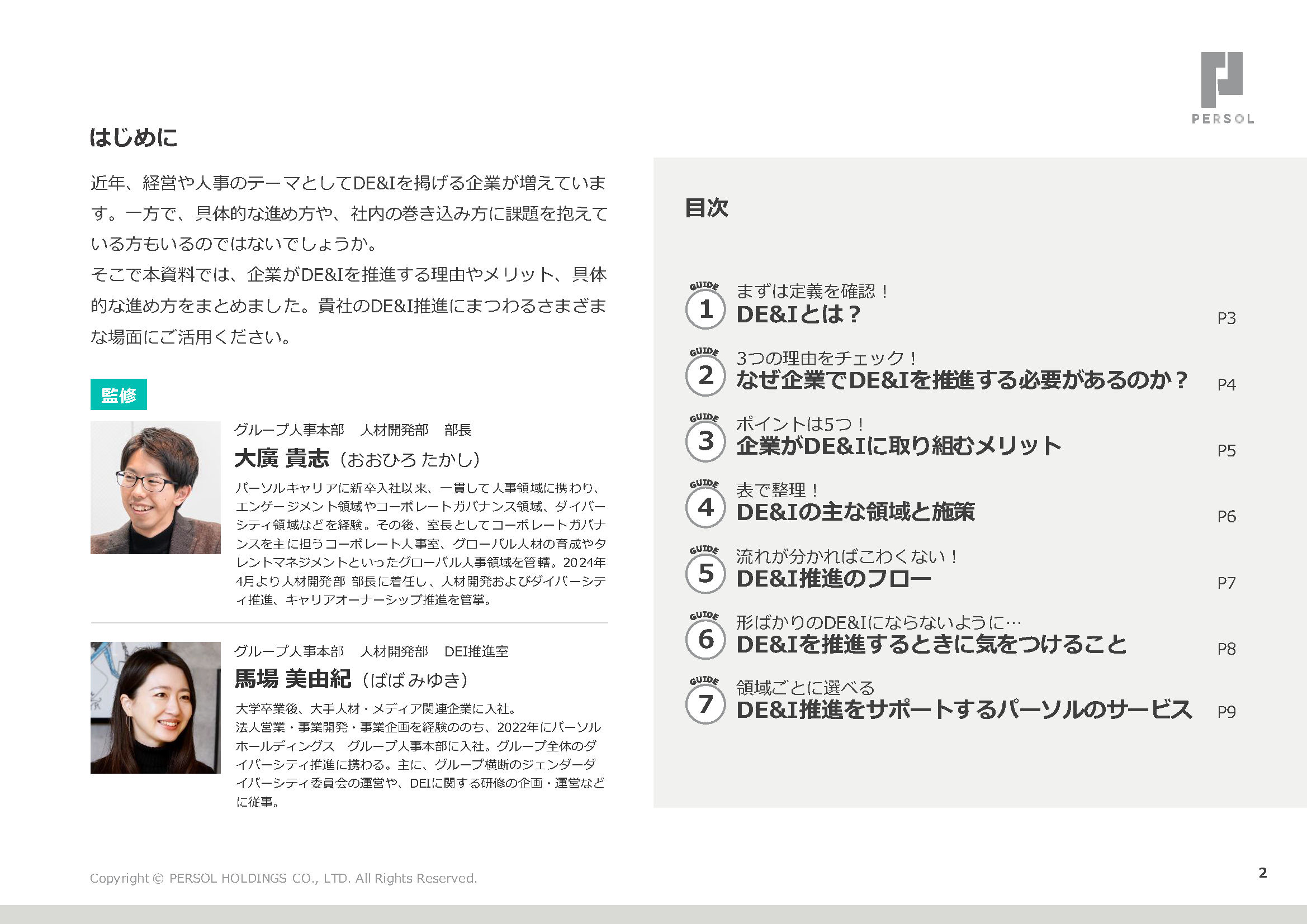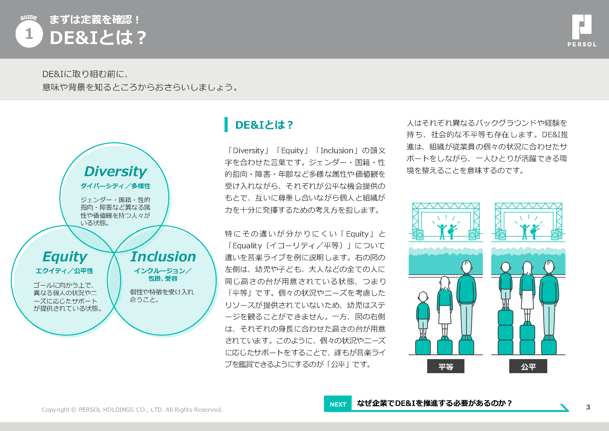 DE&Iの重要性は理解していても、社内で何から始めるべきか、どう進めれば形骸化を防げるのか悩む企業は少なくありません。本資料では、DE&Iを推進する理由、取り組むメリット、具体的な進め方を整理しています。経営・人事部門で方針や進め方を見直したい方におすすめです。