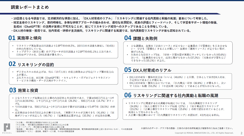 本冊子は、企業のリスキリング施策やDX人材の獲得・育成状況・手法について、四半期ごとの定点調査結果をまとめたものです。
