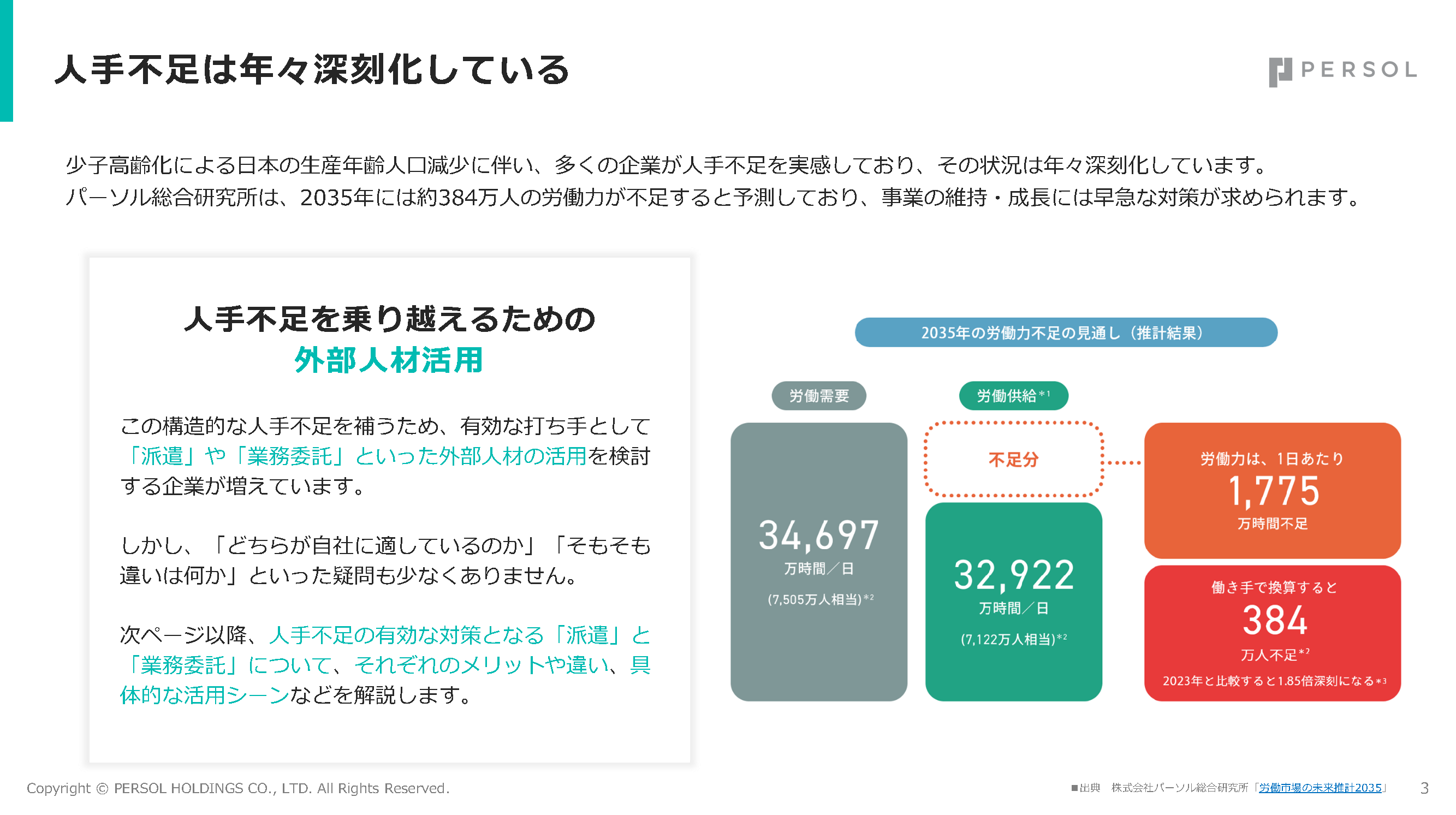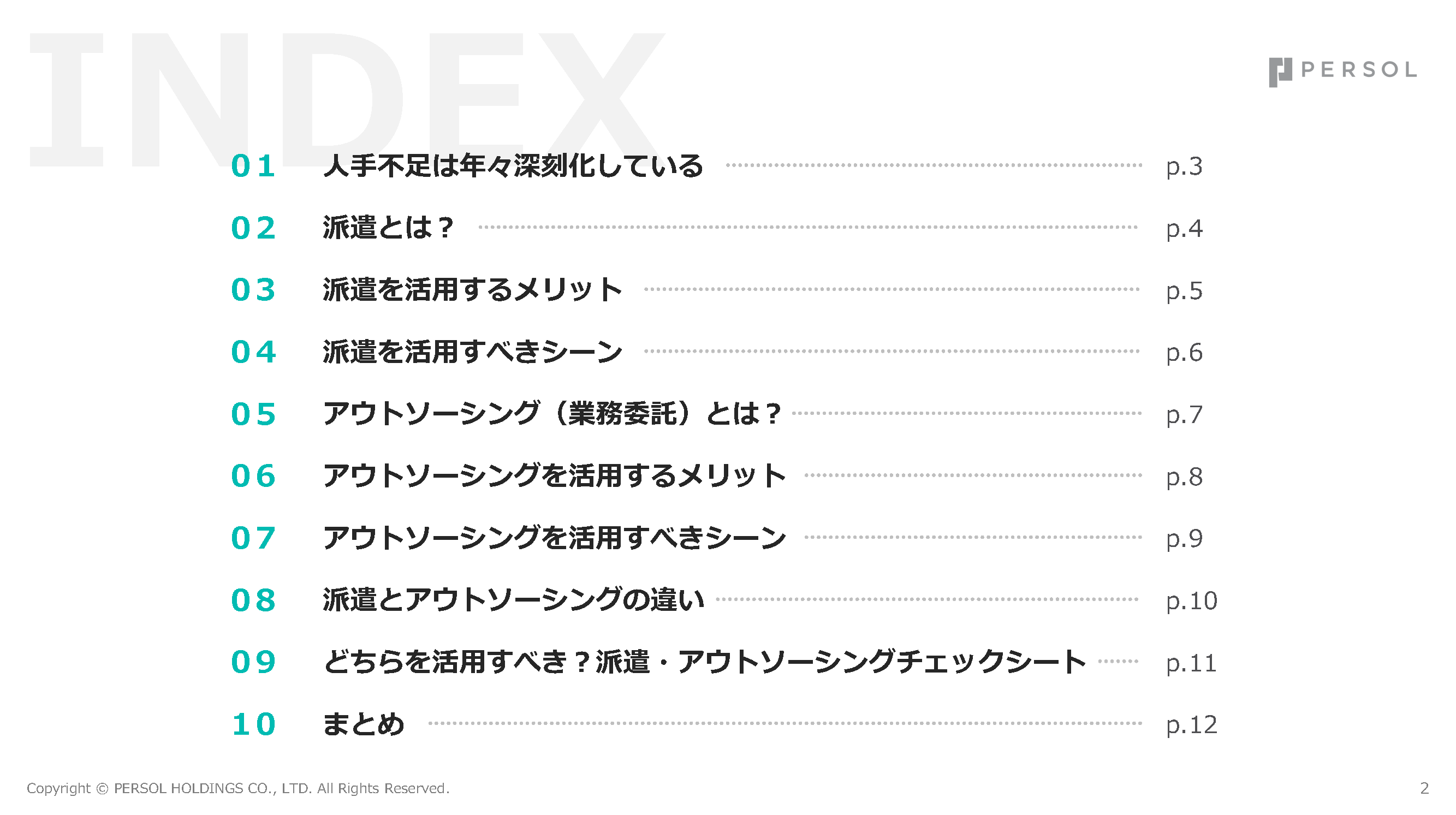 人手不足の解消や業務の切り出しを検討するにあたって、派遣とアウトソーシングどちらが自社に適しているのか迷う方も多いのではないでしょうか。本資料では、契約形態ごとのメリット・注意点・活用すべきシーンについて具体的に解説しています。自社に最適な手段を簡単に判断できるチェックシート付きです。