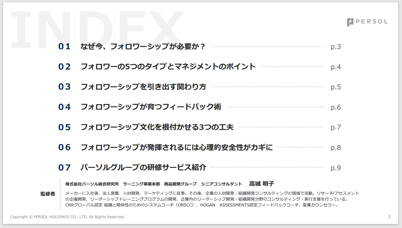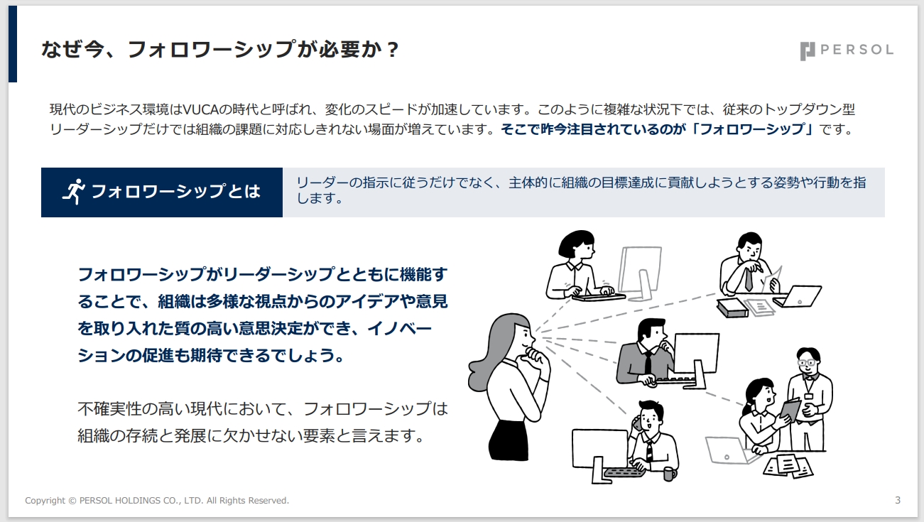 現代のビジネス環境は、変化のスピードが加速するVUCAの時代に突入しています。このような不確実性の高い状況下で、従来のトップダウン型リーダーシップだけでは組織の課題に対応しきれない場面が増えています。そこで注目されているのが「フォロワーシップ」です。本資料では、フォロワーシップを引き出すための具体的な方法や、心理的安全性を高めるリーダーの関わり方について詳しく解説しています。