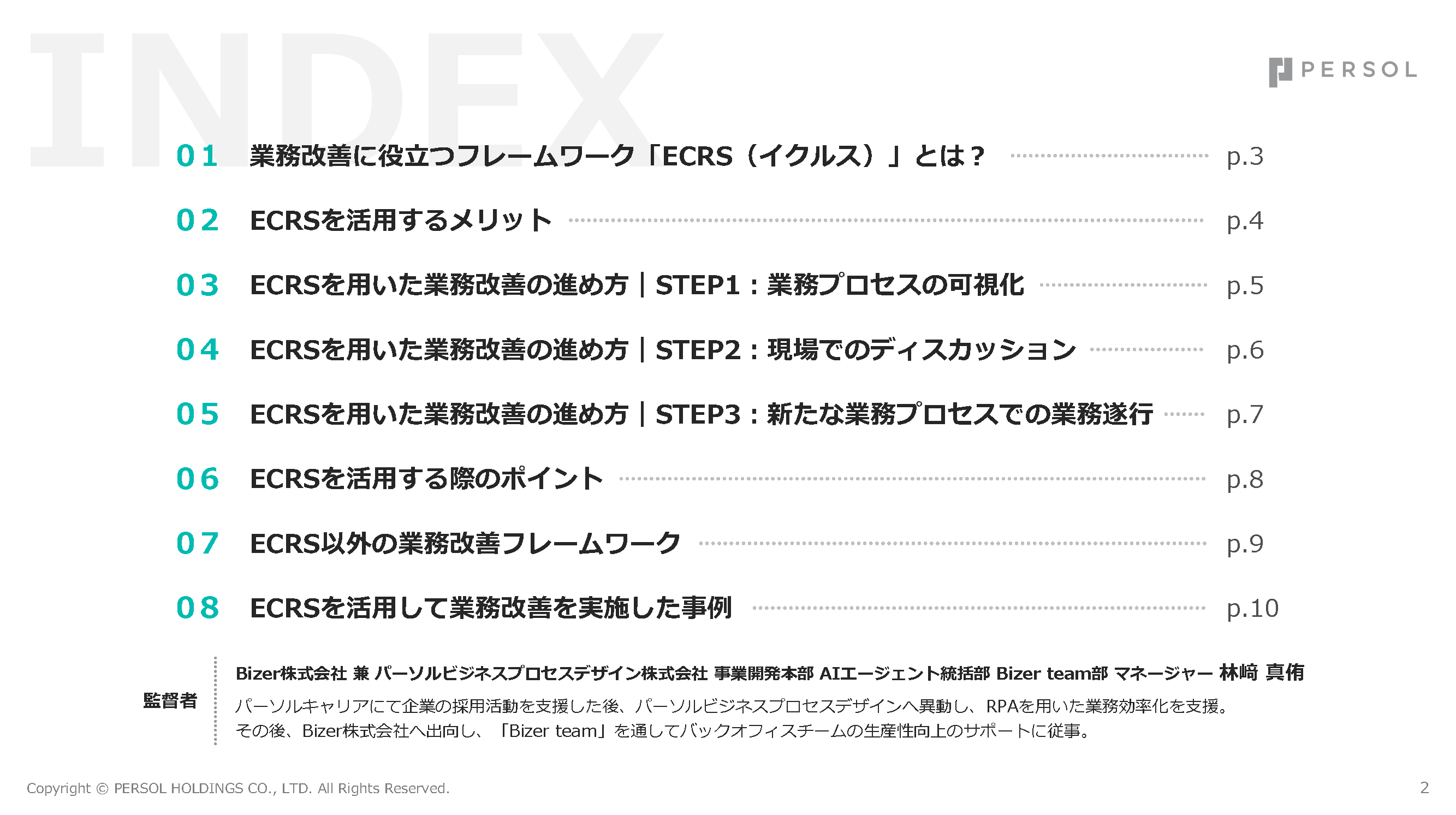 本資料では、業務改善コンサルタントが「ECRSを活用するメリット」「ECRSを用いた業務改善の進め方」「ECRSを活用した事例」についてご紹介します。