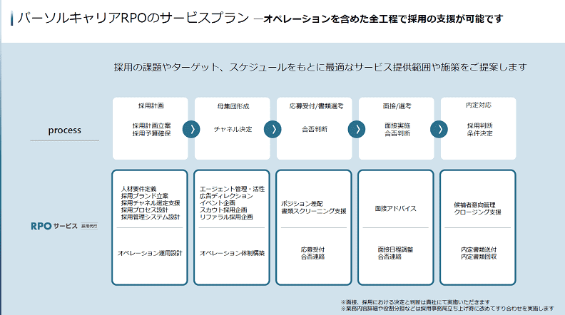 パーソルキャリアのRPOサービスは、採用の全工程をカバーする「総合型RPO」です。豊富な事例とノウハウ、及びマーケット情報を持つ転職サービス「doda」で長年培った知見を生かし効率的な採用活動を代行いたします。