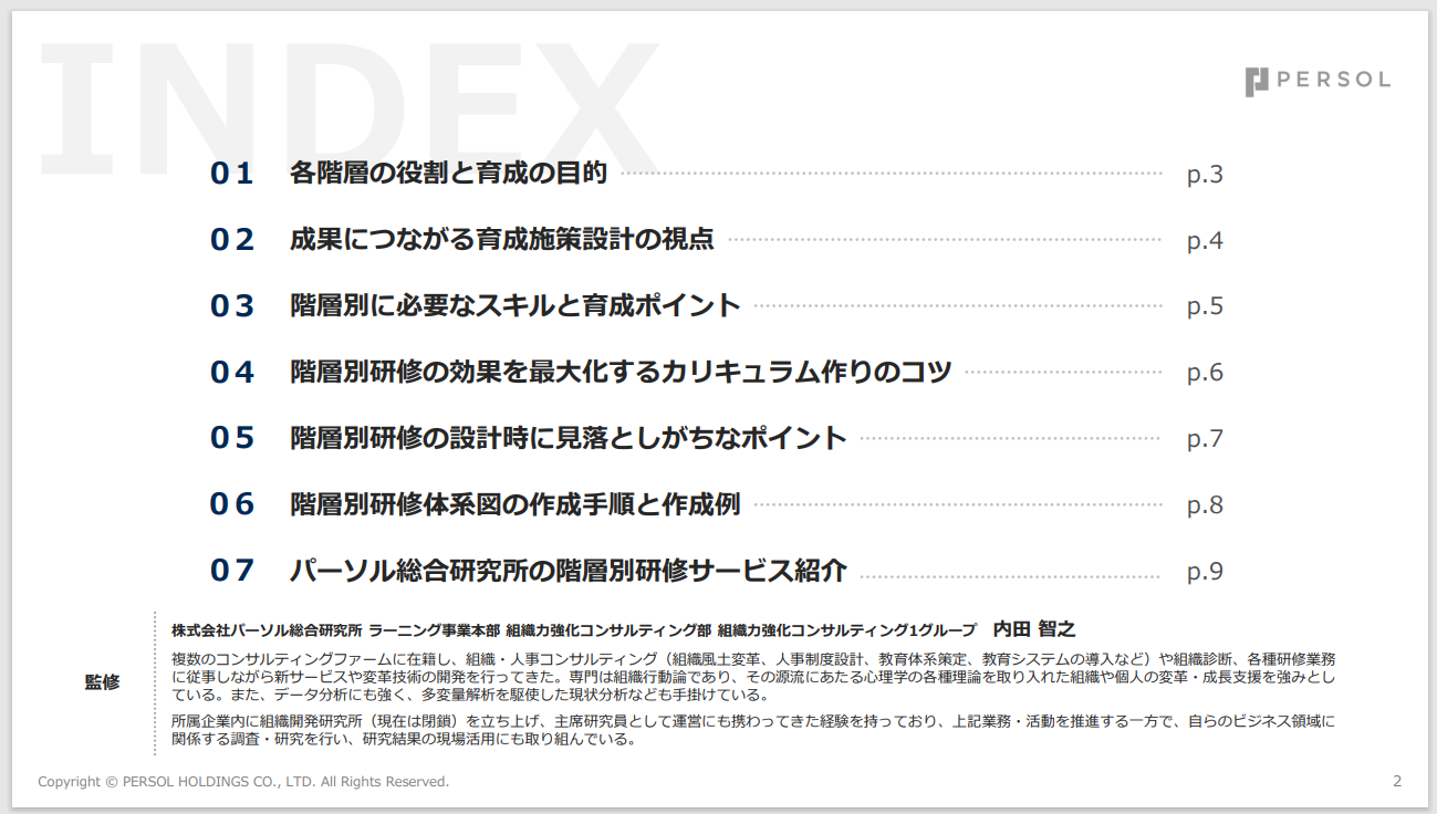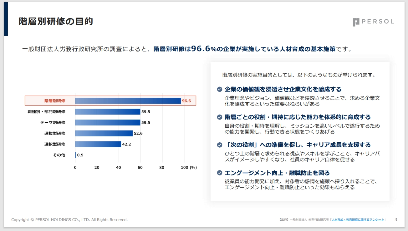 ・階層別研修の設計・運用に課題を感じている方・研修体系を見直し、より効果的な育成施策を導入したい方・各階層に求められるスキルや役割を明確化したい方