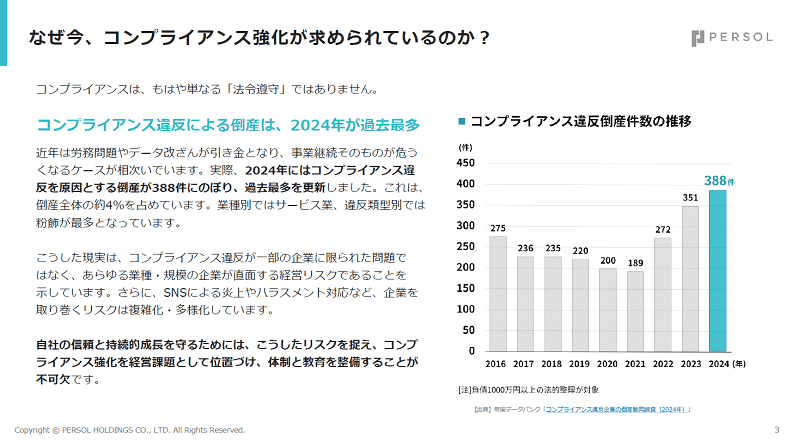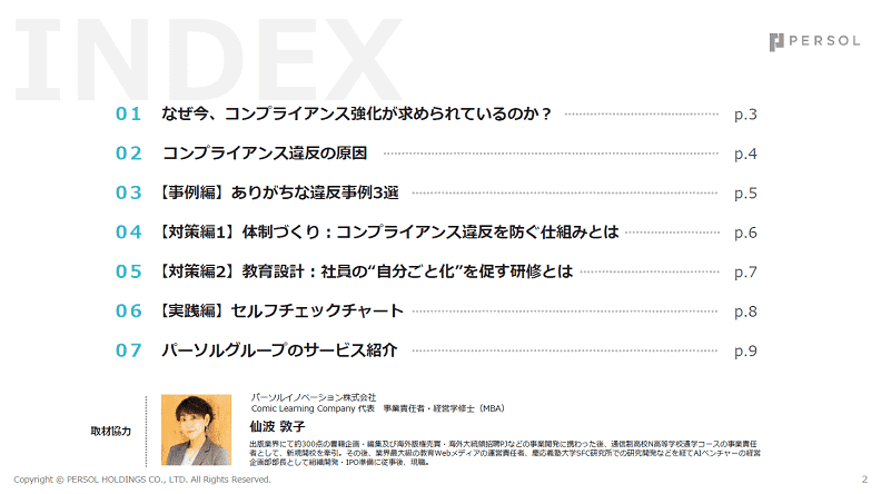 本資料は、企業にとって避けられないリスクである「コンプライアンス違反」を未然に防ぐための実践的なガイドです。ありがちな違反事例から具体的な体制づくり・教育設計について整理し、すぐに活用できるセルフチェックチャートも掲載しています。