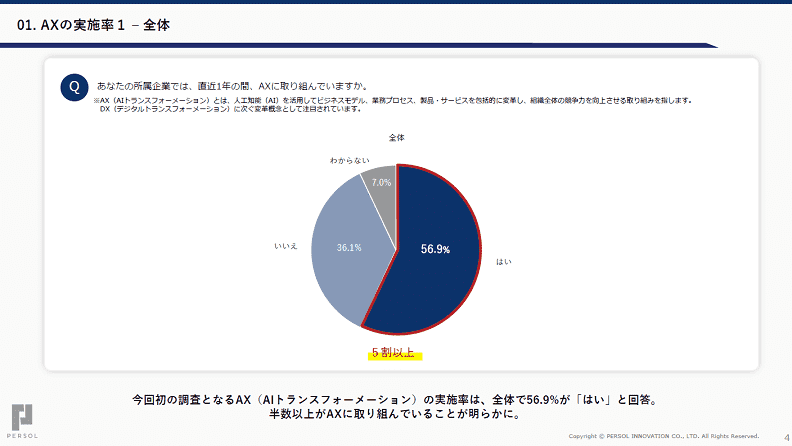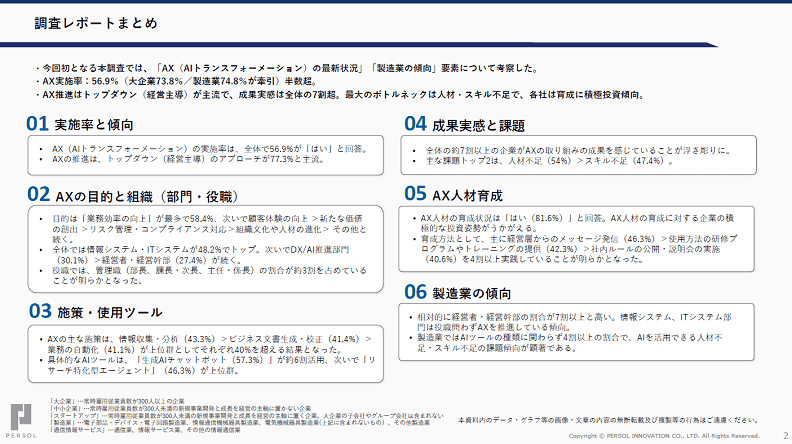 本資料は、AX(AIトランスフォーメーション)の最新動向や、AX/DX人材育成の実態についての調査結果をまとめています。