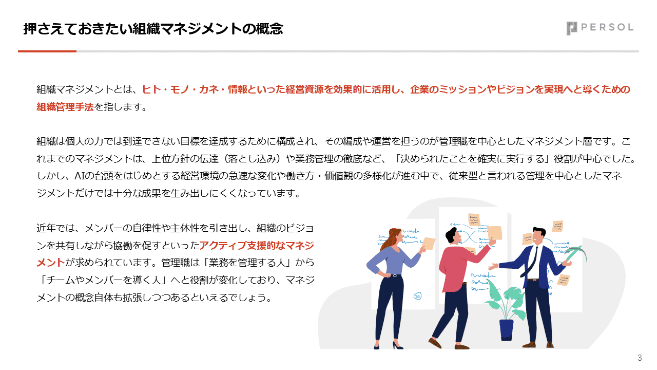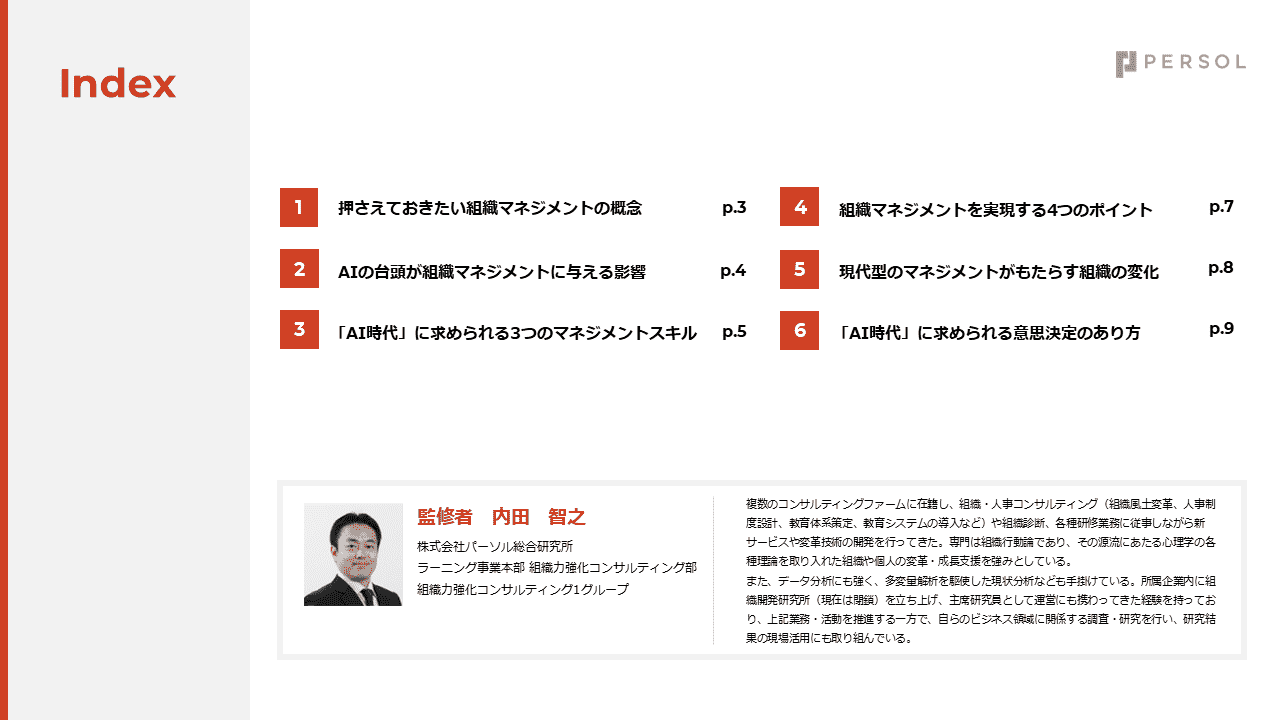 AIの進化によって、組織運営やリーダーシップの在り方は大きな転換期を迎えています。 本資料では、AI時代における組織マネジメントの基本概念から、意思決定・人材育成・チームマネジメントの実践ポイントまでを体系的に整理しています。